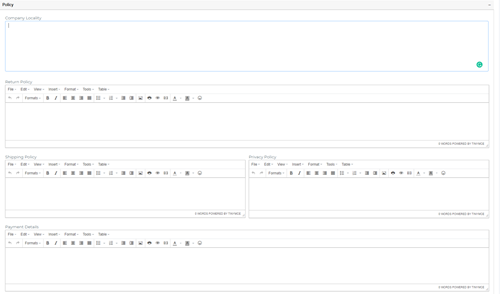 The policy section contains various company policy fields that you can add or edit. This includes company locality, return policy, shipping policy, privacy policy, and shopping details.