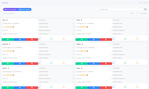 The supplier displays all information about all the suppliers associated with the store. Along with the name of the supplier, the other details that are shown here include: supplier email address, phone number, rating, products, and relevant order information.