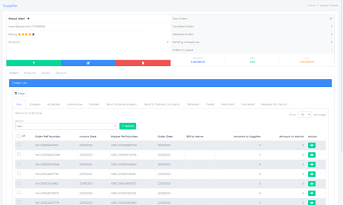 When we view a particular supplier, all their information is available on this page. Along with their basic information and order overview, we also have their order list, products list, store list, and reviews.